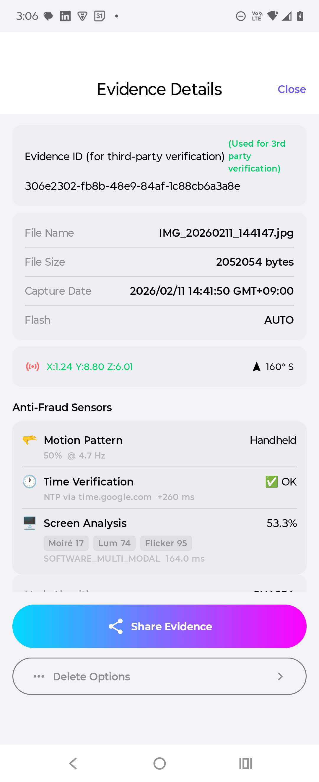 *"World's first" refers to consumer smartphone applications integrating barometric environmental attestation, IMU tremor pattern analysis, NTP time consistency verification, and software-based multi-modal screen recapture detection (moiré + flicker + luminance tri-modal fusion) with RFC 3161 cryptographic timestamps and an open protocol standard (CPP). As of February 11, 2026, according to company research.