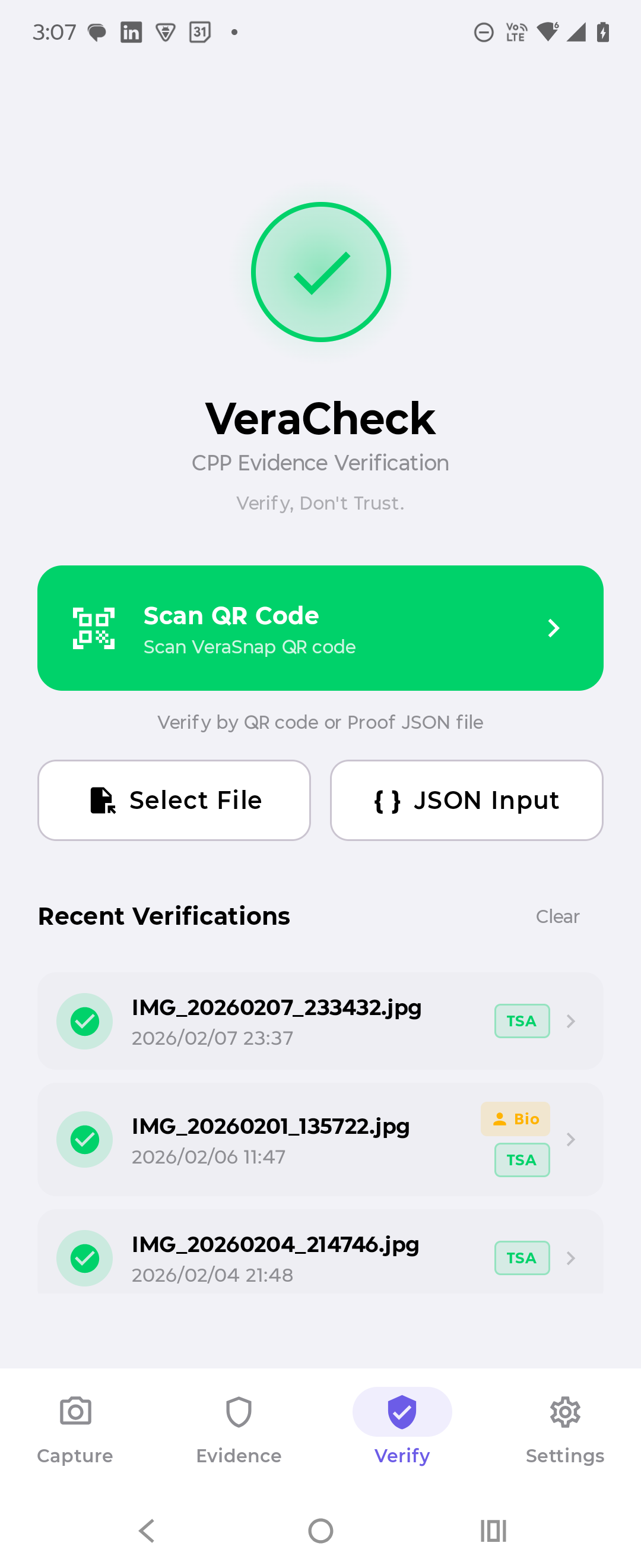 VeraSnap aims to democratize access to cryptographic provenance tools. In the deepfake era, the ability to create verifiable evidence should not be limited to experts or large enterprises. By providing professional-grade cryptographic attestation through an intuitive camera interface, VeraSnap empowers anyone with a smartphone to generate legally defensible digital evidence.